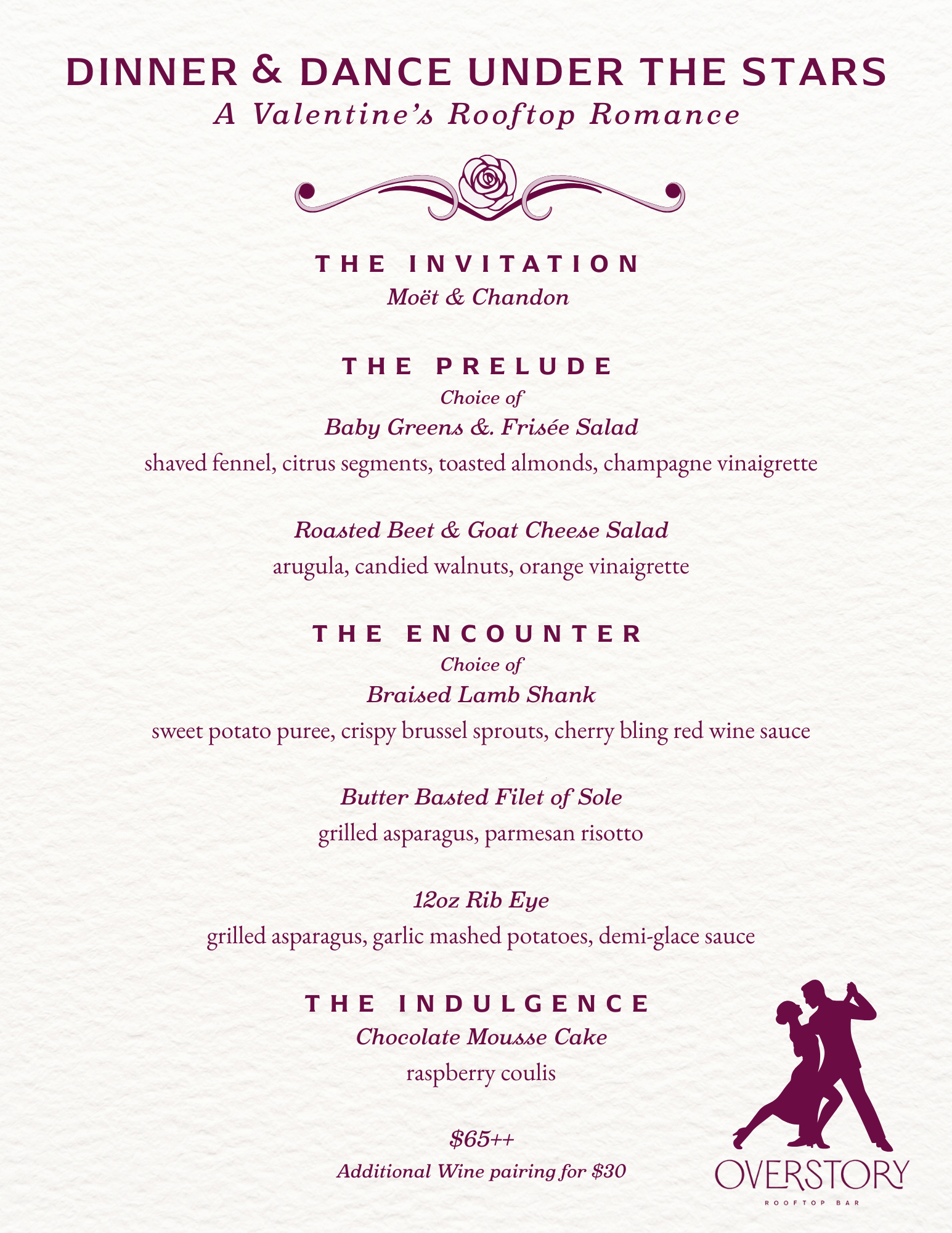 Elevate your Valentine’s celebration at Overstory Rooftop. From February 13th through 15th, join us for an intimate evening designed for romance. Set against the backdrop of the Atlanta skyline, your night begins with a Moët & Chandon welcome toast, followed by a curated prix-fixe dinner.